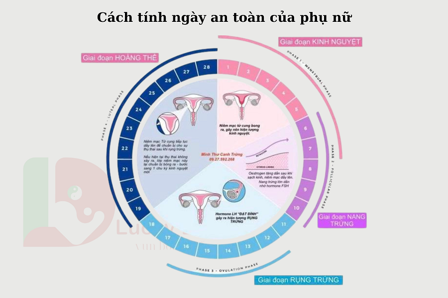 Đối với chu kỳ 30 ngày, trứng thường rụng vào khoảng ngày thứ 15. Nếu chu kỳ bắt đầu ngày 06/05, ngày rụng trứng là 21/05. Giai đoạn an toàn tuyệt đối kéo dài từ ngày 26/05 đến 06/06.