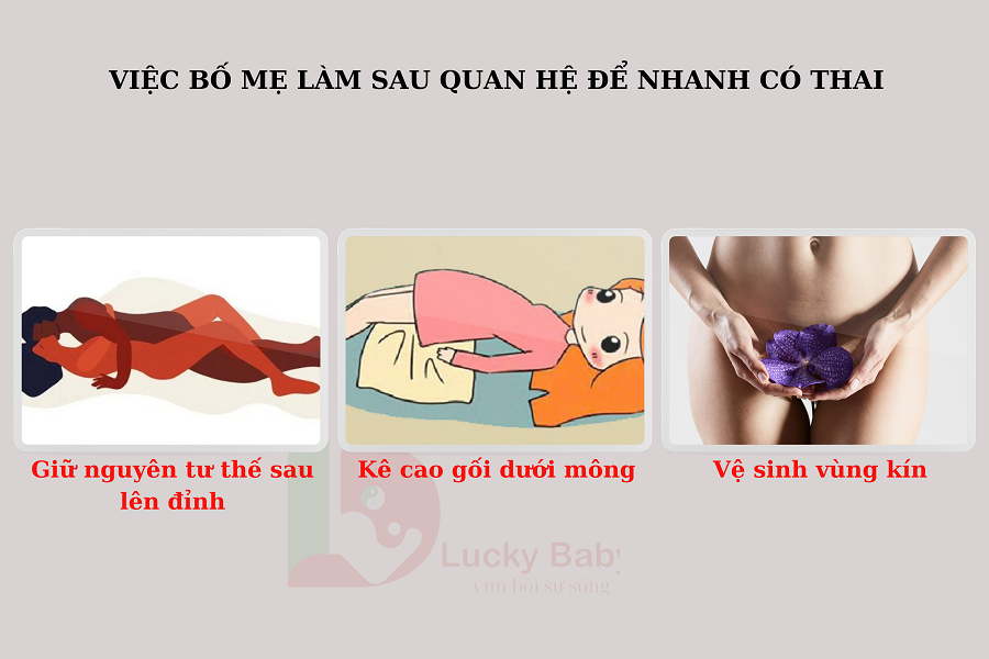 Yếu tố Mang Thai phụ thuộc vào rất nhiều yếu tố, từ sức khỏe của tinh trùng ở nam giới đến trứng ở phụ nữ, thời điểm quan hệ và cả yếu tố ngay sau khi quan hệ bố mẹ muốn có thai thì nên giữ nguyên tư thế sau khi “ lên đỉnh”, sau đó mẹ nằm yên. Kê cao gối dưới mông giữ tinh trùng không bị trôi ra ngoài. Chú ý khi vệ sinh vùng kín sau khi quan hệ: