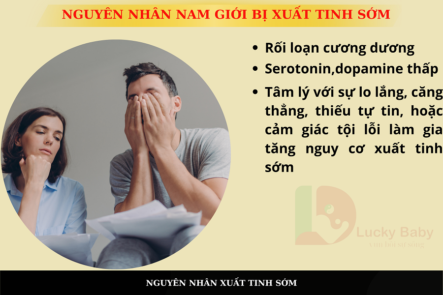 Nguyên nhân gây xuất tinh sớm ở nam giới có thể xuất phát từ nhiều yếu tố. Về mặt thể chất, các vấn đề như rối loạn cương dương, mức serotonin hoặc dopamine thấp, hay các vấn đề về nội tiết tố có thể góp phần gây ra tình trạng này. Tâm lý cũng đóng vai trò quan trọng, với sự lo lắng, căng thẳng, thiếu tự tin, hoặc cảm giác tội lỗi làm gia tăng nguy cơ xuất tinh sớm. Ngoài ra, thói quen thủ dâm quá nhiều, đặc biệt là với tốc độ nhanh, có thể tạo thành phản xạ xuất tinh sớm khi quan hệ thực tế. Các yếu tố khác như mối quan hệ căng thẳng với bạn tình, hoặc tình trạng sức khỏe tổng thể kém cũng có thể là nguyên nhân. Theo thống kê, xuất tinh sớm ảnh hưởng đến khoảng 30%-40% nam giới, làm giảm chất lượng cuộc sống và sự tự tin trong quan hệ tình dục.