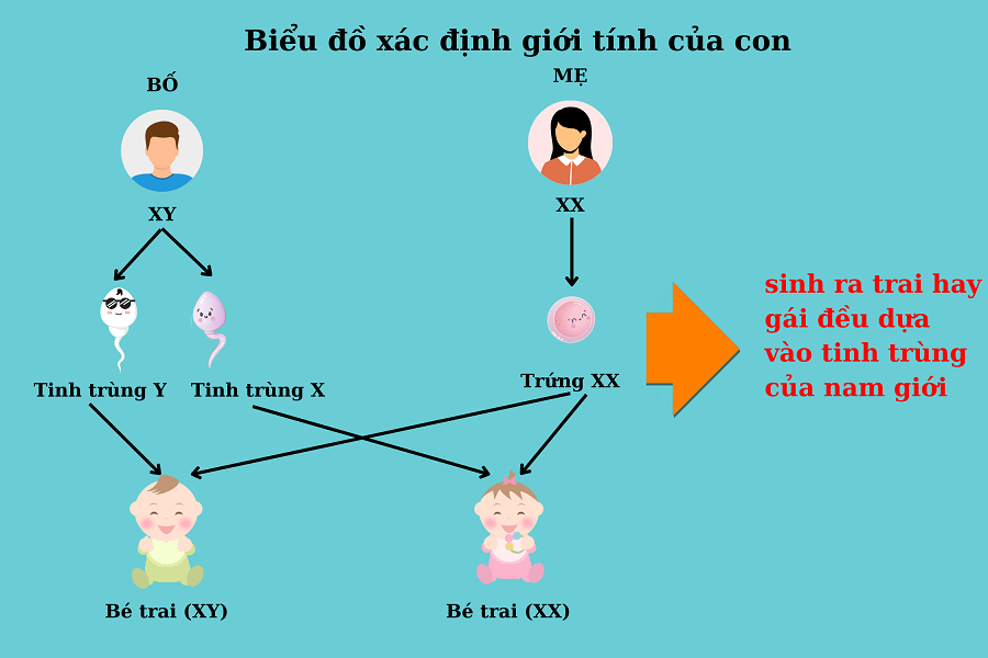 Giới tính của em bé được xác định ngay từ lúc thụ tinh, khi tinh trùng của bố gặp trứng của mẹ. Trứng của người mẹ chỉ mang nhiễm sắc thể X, trong khi tinh trùng của bố mang 50% nhiễm sắc thể X và 50% nhiễm sắc thể Y. Nếu tinh trùng mang nhiễm sắc thể X thụ tinh với trứng, em bé sẽ là con gái (XX). Ngược lại, nếu tinh trùng mang nhiễm sắc thể Y kết hợp với trứng, em bé sẽ là con trai (XY).
