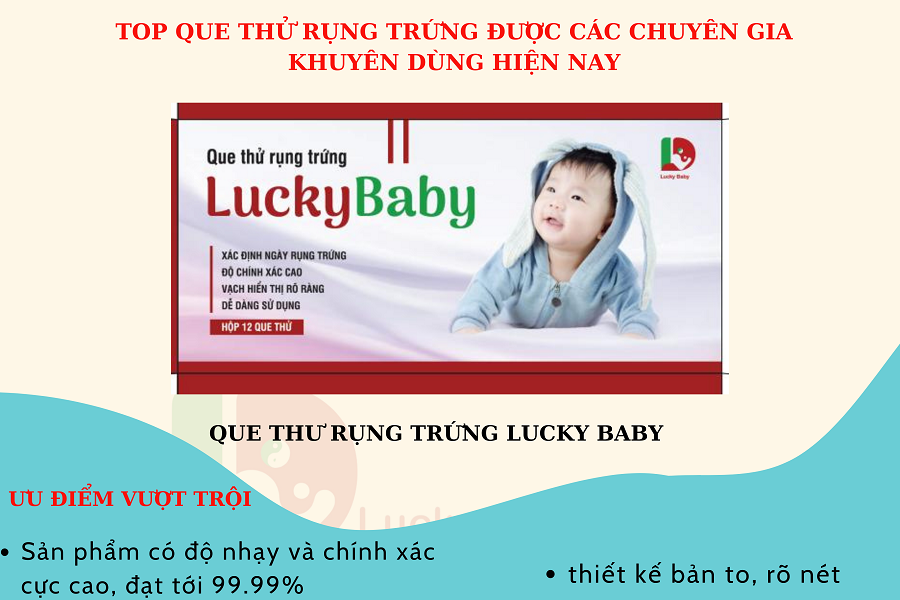 Để tăng độ chính xác bạn hãy sử dụng que thử rụng trứng Lucky- Baby có chất lượng và uy tín hàng đầu hiện nay. Que thử rụng trứng Lucky Baby nổi bật với thiết kế bản to, dễ sử dụng hơn so với các dòng que thông thường. Sản phẩm có độ nhạy và chính xác cực cao, đạt tới 99.99%, giúp chị em xác định thời điểm rụng trứng một cách chính xác nhất. Que thử Lucky Baby đã được FDA và CE công nhận về chất lượng, đảm bảo an toàn và hiệu quả trong việc hỗ trợ kế hoạch ngừa thai hiệu quả.