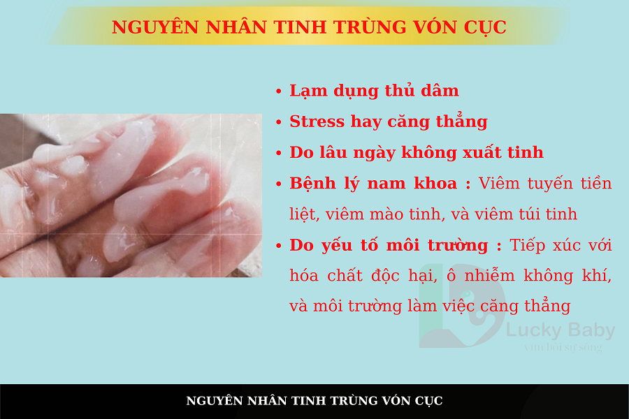 Do lâu ngày không xuất tinh : Lâu ngày không xuất tinh có thể khiến tinh trùng vón cục. Khi tinh dịch tồn đọng quá lâu trong cơ thể, các tinh trùng và chất lỏng khác có thể bị đặc lại và hình thành các hạt li ti. Điều này làm giảm chất lượng và khả năng di chuyển của tinh trùng.