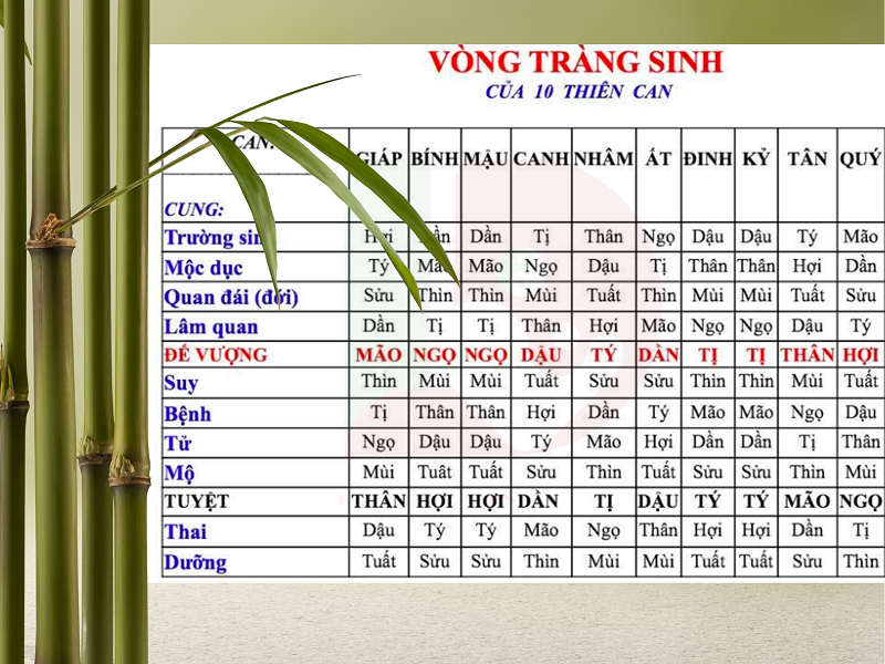 Tràng Sinh tại Dần, Mộc Dục tại Mão, Quan Đới tại Thìn, Lâm Quan tại Tỵ, Đế Vượng tại Ngọ, Suy tại Mùi, Bệnh tại Thân, Tử tại Dậu, Mộ tại Tuất, Tuyệt tại Hợi, Thai tại Tý, Dưỡng tại Sửu