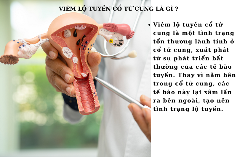Viêm lộ tuyến cổ tử cung là một tình trạng tổn thương lành tính ở cổ tử cung, xuất phát từ sự phát triển bất thường của các tế bào tuyến. Thay vì nằm bên trong cổ tử cung, các tế bào này lại xâm lấn ra bên ngoài, tạo nên tình trạng lộ tuyến. Điều này gây ra nhiều triệu chứng khó chịu cho người bệnh, bao gồm việc tăng tiết dịch âm đạo, xuất hiện khí hư có mùi, cùng với cảm giác ngứa ngáy, khó chịu.